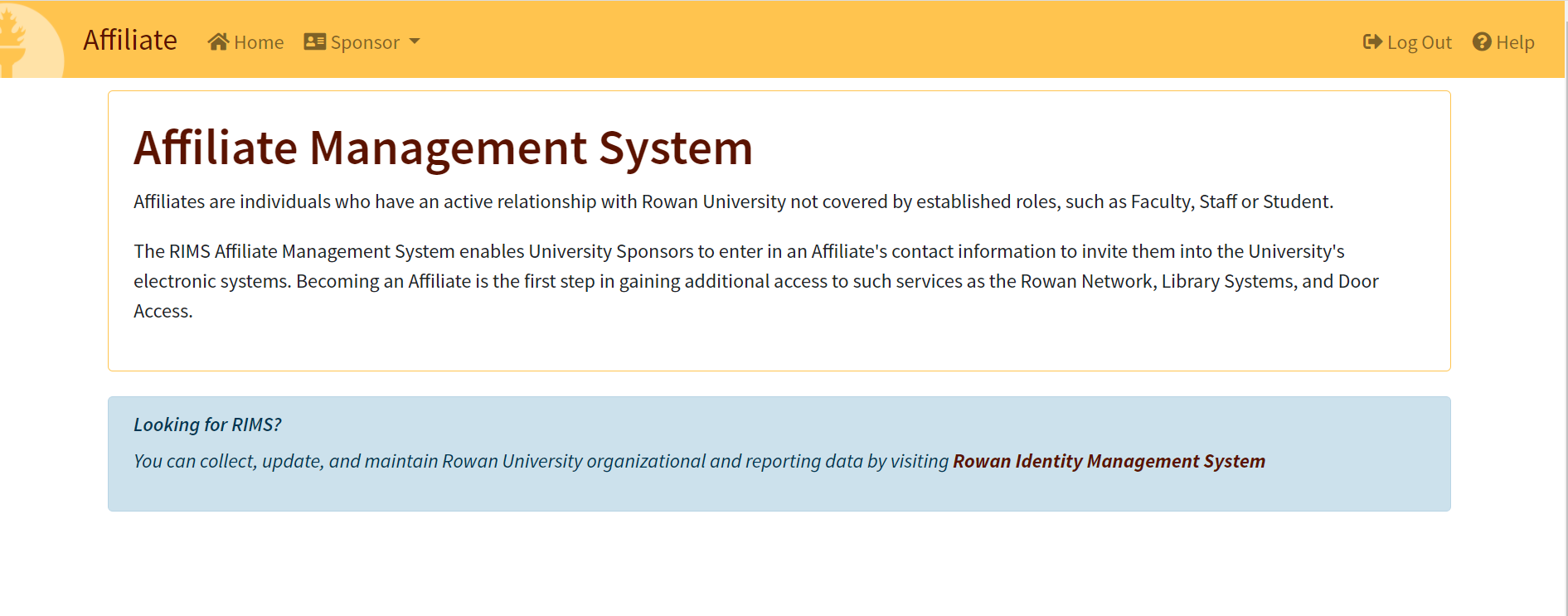 Sponsors must complete their assigned security training and acknowledge the terms of the Affiliate Access Policy before accessing the new RIMS Affiliate Management System. New sponsors will need to submit a request to be setup as a sponsor as well as have an affiliation group created, before accessing the new system. Both requests may be submitted at support.rowan.edu.