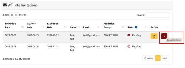 - Under Affiliate Invitations, search for the affiliate you would like to revoke the invitation
